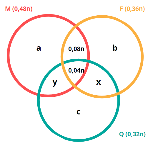 egin{cases} a+ 0,08n + 0,04n + y = 0,48n\ b+0,08n+0,04n+x = 0,36n\ c + 0,04n + x + y = 0,32n end{cases} Leftrightarrow  egin{cases} a+ 0,12n + y = 0,48n\ b+0,12n+x = 0,36n\ c + 0,04n + x + y = 0,32n end{cases} Leftrightarrow  egin{cases} a+ y = 0,36n\ b+x = 0,24n\ c + x + y = 0,28n end{cases}