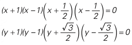 egin{align*} (x^{2}-1)(x^{2}-frac{1}{4}) &= 0\ (y^{2}-1)(y^{2}-frac{3}{4})&= 0 end{align*}