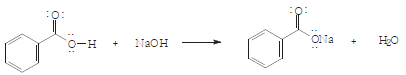 ii) Ocorre reação de neutralização ácido básico. Ocorre a reação então do ácido benzoico e o NaOH, que formará o Benzoato de sódio e água.