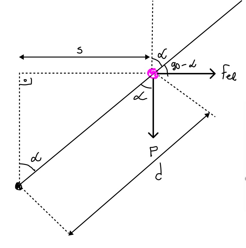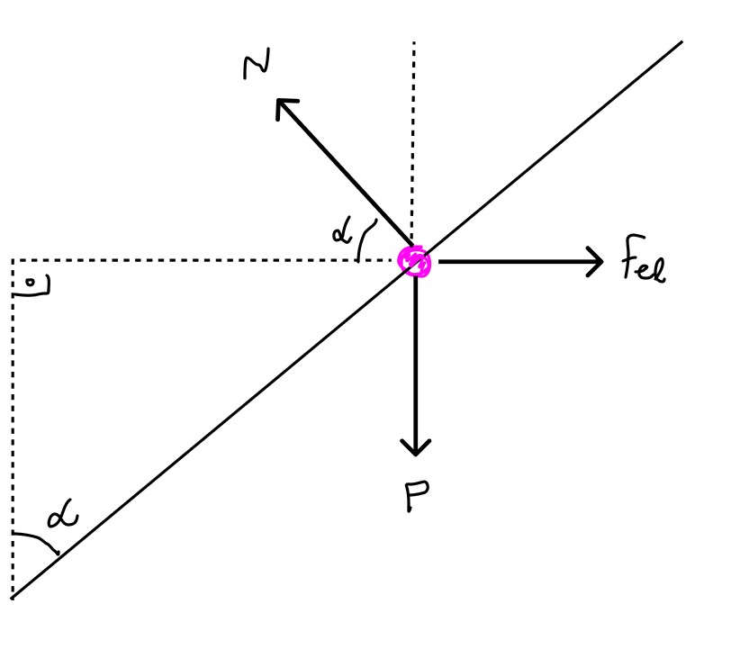 Um sistema mecânico é formado por duas partículas de massas m conectadas por uma mola, de constante elástica k e comprimento natural 2ℓ0, e duas barras formando um ângulo fixo de 2α, conforme a figura. As partículas podem se mover em movimento oscilatório, sem atrito, ao longo das barras, com a mola subindo e descendo sempre na horizontal. Determine a frequência angular da oscilação e a variação ∆ℓ = ℓ0 −ℓ1, em que ℓ1 é o comprimento da mola em sua posição de equilíbrio.