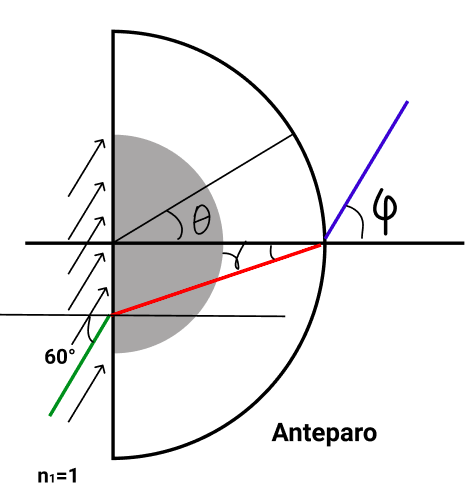 O raio vermelho chega na face esférica da lente e, se ele encosta no ponto laranja, matematicamente temos . Reaplicando a Lei de Snell a esta face temos que