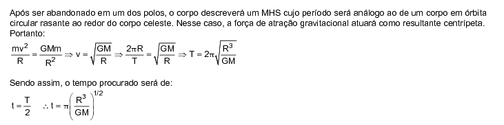 Considere um corpo celeste esférico e homogêneo de massa M e raio R atravessado de polo a polo por um túnel cilíndrico retilíneo de diâmetro desprezível. Em um desses polos um objeto pontual é solto a partir do repouso no instante t=0. Sendo G a constante universal de gravitação, esse objeto vai alcançar polo após o intervalo de tempo dado por