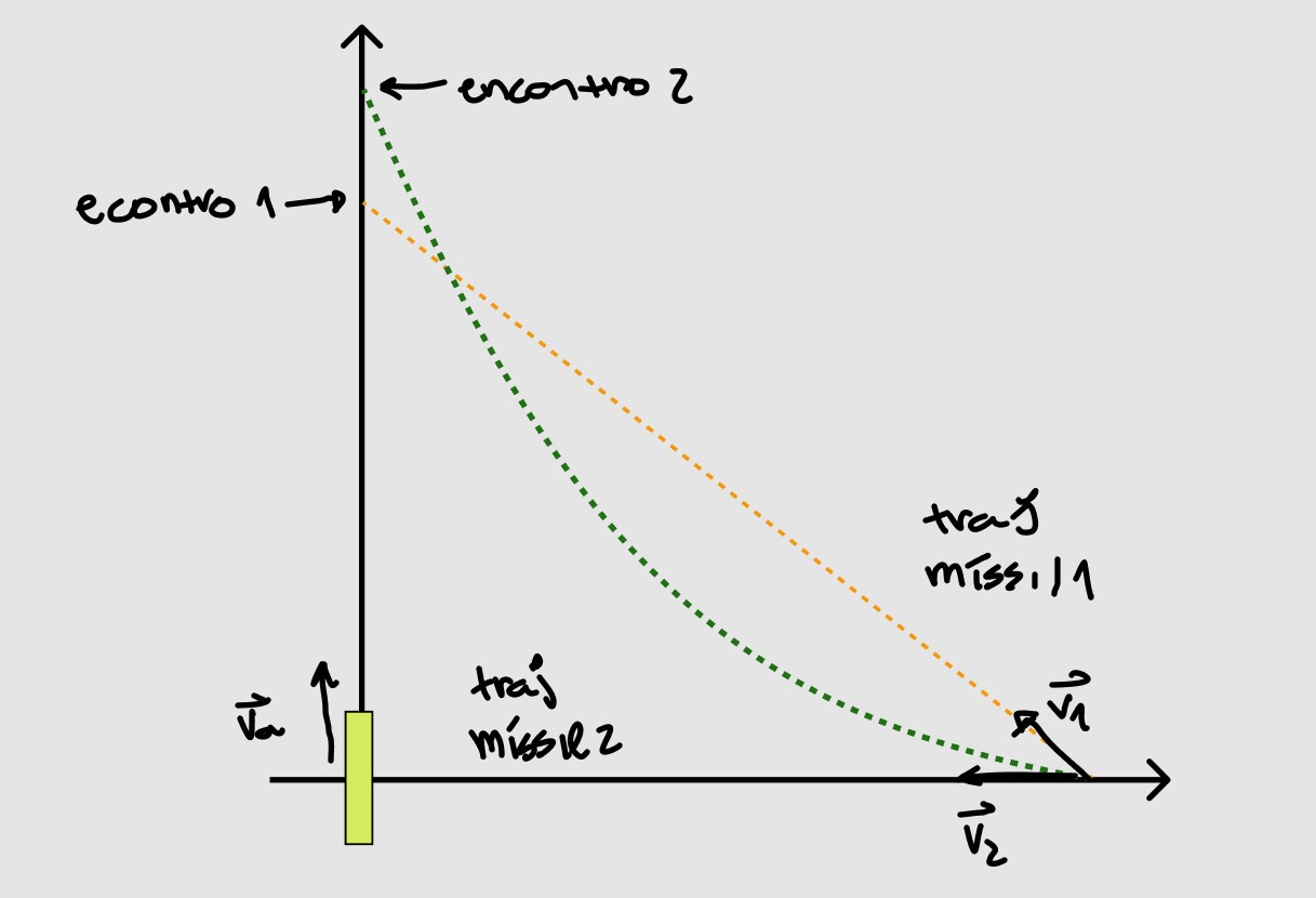 Um sistema de defesa aérea testa separadamente dois mísseis contra alvos móveis que se deslocam em velocidade , constante ao longo de uma reta distante de d do ponto de lançamento dos mísseis. Para atingir o alvo, o míssil 1 executa uma trajetória retilínea, enquanto o míssil 2, uma trajetória com velocidade sempre orientada para o alvo. A figura ilustra o instante de disparo de cada míssil, com o alvo passando pelo origem do sistema de coordenadas xy. Sendo os módulos das velocidades dos mísseis iguais entre si, maiores que