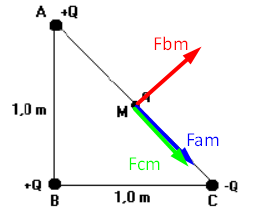 No ponto médio M da hipotenusa do triângulo, é fixada uma carga puntiforme q, a qual ficará sujeita à ação de uma força resultante . A intensidade de