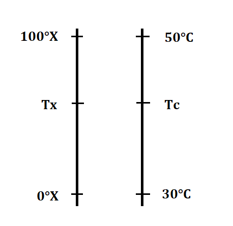 Pelo gráfico, podemos inferir que a temperatura de 30ºC equivale a 0ºX enquanto a temperatura de 50ºC equivale a 100ºX. Montando a escala:
