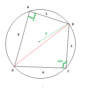 O quadrilátero convexo ABCD, cujos lados medem, consecutivamente, 1, 3, 4 e 6 cm, está inscrito em uma circunferência de centro O e raio R.