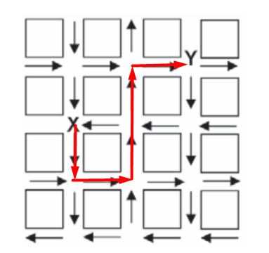 (ENEM PPL - 2009) O mapa a seguir representa um bairro de determinada cidade, no qual as flechas indicam o sentido das mãos do tráfego.