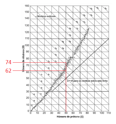 Analisando o gráfico, oberserva-se que o número de nêutrons dos isótopos estáveis do elemento cujo número atômico é 50 varia de 62 a 74.