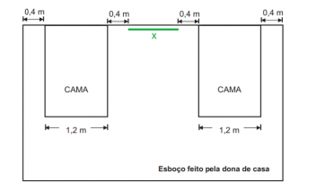 Uma dona de casa pretende comprar uma escrivaninha para colocar entre as duas camas do quarto de seus filhos. Ela sabe que o quarto é retangular, de dimensões 4 m × 5 m, e que as cabeceiras das camas estão encostadas na parede de maior dimensão, onde ela pretende colocar a escrivaninha, garantindo uma distância de 0,4 m entre a escrivaninha e cada uma das camas, para circulação. Após fazer um esboço com algumas medidas, decidirá se comprará ou não a escrivaninha.