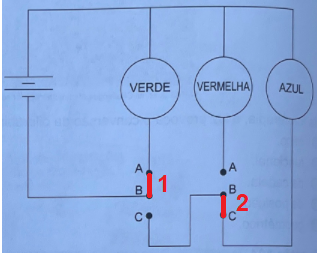 Perceba que se o 1 está na posição AB somente a lâmpada verde estará ligado, quando acionar esse interruptor para a posição BC enquanto o interruptor 2 Estiver em BC a lâmpada azul estarla ligada e o restante apagada, quando for para a posição AB somente a vermelha irá acionar.