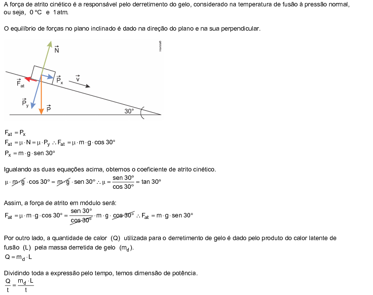 Considere um bloco de gelo de 80,0 kg deslizando, com velocidade constante v, em um plano inclinado de 30° com a horizontal. Sabendo que a massa de gelo que derrete por minuto, em consequência do atrito, é de 20,0 g, e que o calor latente de fusão do gelo é 336 J/g, qual o valor da velocidade v, em centímetros por segundo?