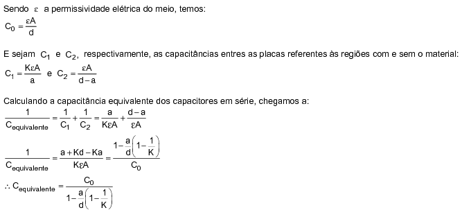 Considere inicialmente um capacitor no vácuo com placas paralelas, de área A, separadas por uma distância d. A seguir é inserido um material, com constante dielétrica k e espessura a, paralelamente entre suas placas, conforme figura abaixo.