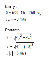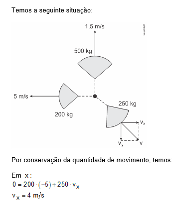 (Esc. Naval 2020) Em uma pedreira, uma carga de dinamite é inserida em uma fissura de uma rocha de 950kg e então detonada. Como resultado dessa explosão, a rocha se divide em três pedaços: um pedaço de 200kg que parte com velocidade de 5m/s paralelamente ao solo; e um segundo pedaço de 500kg que sai perpendicularmente ao primeiro pedaço com velocidade de 15m/s Sendo assim, é correto afirmar que a velocidade do terceiro pedaço é: