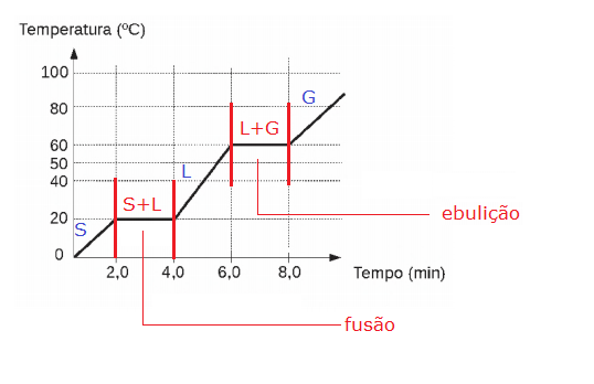 De 4,0min a 6,0min, a substância X se encontra no estado líquido. Do tempo 6,0min ao tempo 8,0min, a temperatura permanece constante em 60ºC, o que corresponde à mudança de estado físico do líquido pro gasoso — ebulição. A partir do tempo 8,0min, a substância X se encontra no estado gasoso.