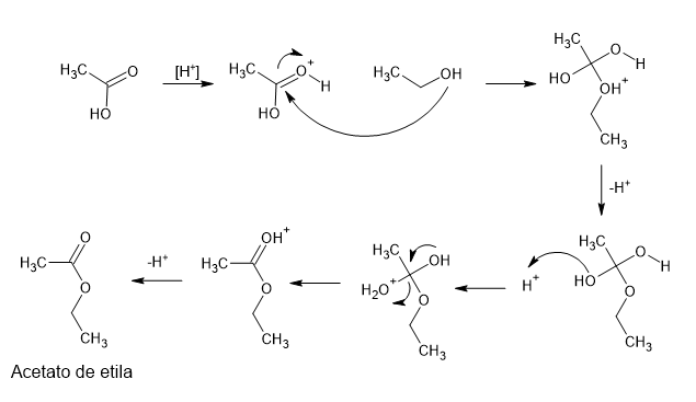 Para se obter acetato de etila a partir do etanol, deve-se fazer uma reação de esterificação com o ácido etanóico. O mecanismo está descrito abaixo: