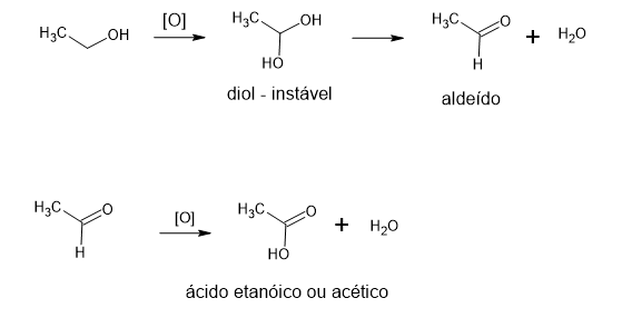 Para se obter ácido acético a partir do etanol, deve-se fazer uma oxidação que pode ser descrita pelo mecanismo simplificado abaixo: