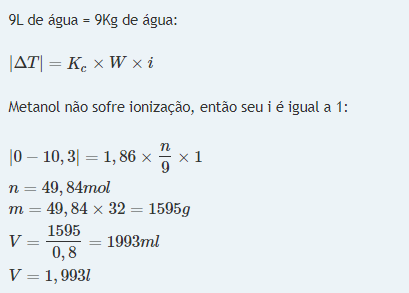 (IME 1989) Qual o volume de metanol, de massa específica 0,800 g/mL, que deve ser adicionado ao radiador de um veículo contendo 9,00 L de água, para que o congelamento não ocorra antes de a temperatura ambiente cair abaixo de -10,3 ºC?