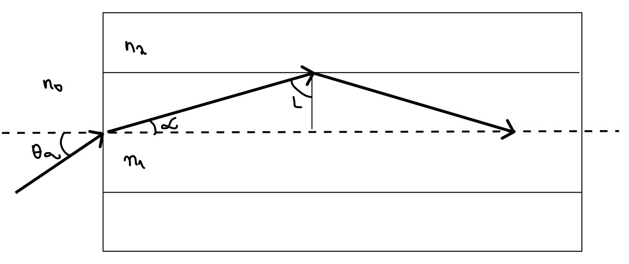 As fibras ópticas funcionam pelo Princípio da Reflexão Total, que ocorre quando os raios de luz que seguem determinados percursos dentro da fibra são totalmente refletidos na interface núcleo-casca, permanecendo no interior do núcleo. Considerando apenas a incidência de raios meridionais e que os raios refratados para a casca são perdidos, e ainda, sabendo que os índices de refração do ar, do núcleo e da casca são dados, respectivamente, por n0,n1, e n2 (n1 > n2 > n0) o ângulo máximo de incidência , na interface ar-núcleo, para o qual ocorre a reflexão total no interior da fibra é: