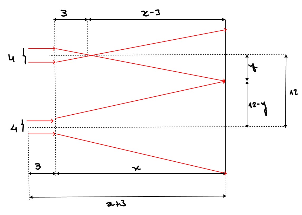 Sabendo que a distância entre os centros ópticos das duas lentes é y = 12 cm, a distância máxima x entre os centros ópticos das lentes O e o anteparo, em centímetros, que faz com que a luz projetada pelas lanternas não se sobreponha é: