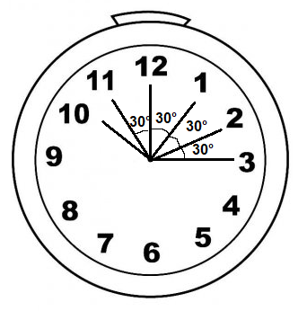 Como o relógio faz uma volta completa de 360° em 12 horas, cada hora completa é um ângulo completo de 30°.