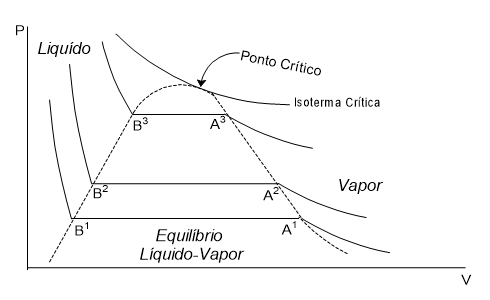A figura a seguir mostra de forma esquemática três isotermas, pressã o versus volume, para o caso de um gás id eal. Trace isotermas análogas para o caso de um gás real que , por compressão, acaba to talmente liqüefeito. No seu gráfico deve ficar claro, para cada isoterma, quai s são os pontos que correspondem ao início e ao fim da liqüefaçã o em função da redução de volume.