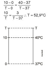 (ITA - 2001) Para medir a febre de pacientes, um esudante de medicina criou sua própria escala linear de temperaturas. Nessa nova escala, os valores de 0 a 10 correspondem respectivamente a 37°C e 40°C. A temperatura de mesmo valor numérico em ambas escalas é aproximandamente: