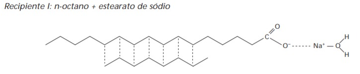 Dois recipientes contêm soluções aquosas diluídas de estearato de sódio (CH3(CH2)16COONa). Em um deles é adicionada uma porção de n-octano e no outro, uma porção de glicose, ambos sob agitação. Faça um esquema mostrando as interações químicas entre as espécies presentes em cada um dos recipientes.