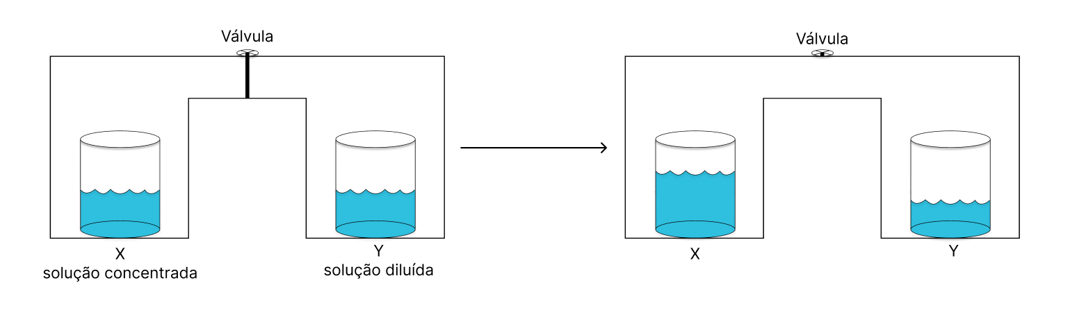 Como a solução Y é hipotônica em relação a solução X, quando a válvula for aberta ocorrerá migração do solvente da solução Y para X. Após o reestabelecimento do equilíbrio, as concentração das duas soluções são iguais. Portanto, o volume final de X é maior que o volume inicial de X