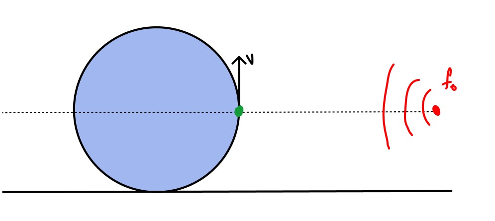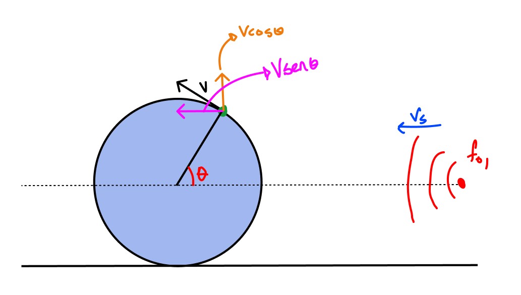 A imagem acima representa a situação inicial. No eixo horizontal não temos componente da velocidade, portanto não há efeito doppler acontecendo, de maneira tal que a frequência aparente f será exatamente igual à frequência f0 :
