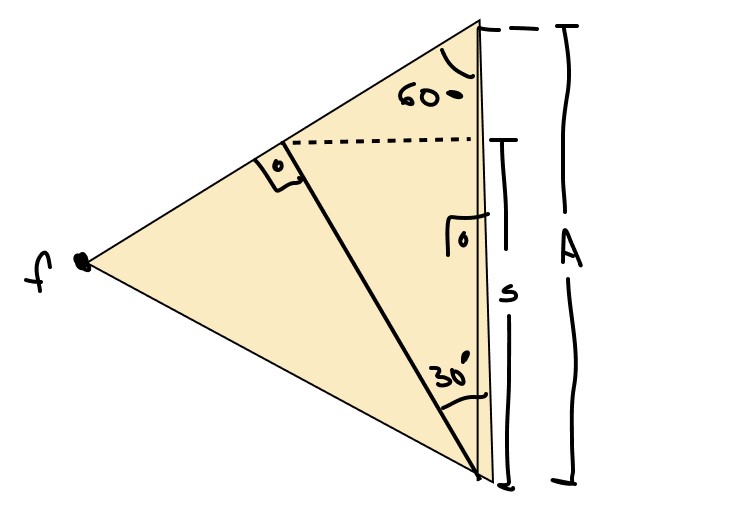 [ITA 2012 - 1 FASE] Uma fonte luminosa uniforme no vértice de um cone reto tem iluminamento energético ( fluxo energético por unidade de área) HA na área A da base desse cone. O iluminamento incidente numa seção desse cone que forma ângulo de 30º com a sua base, e de projeção vertical S sobre esta , é igual a: