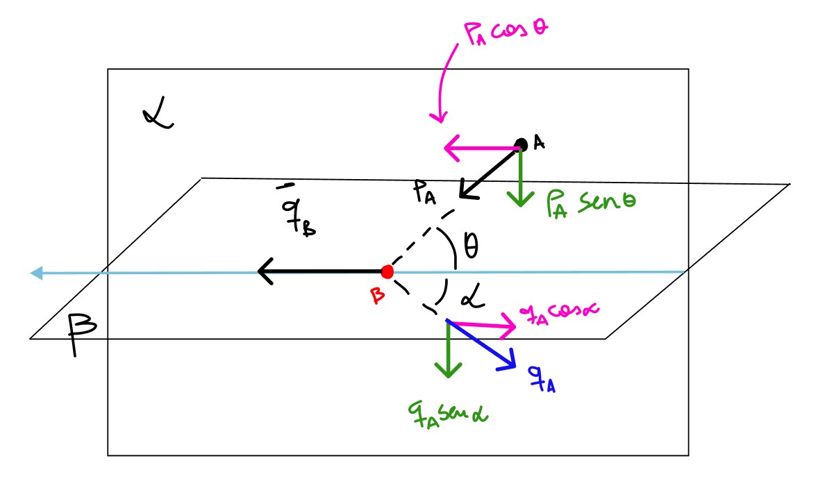 Átomos neutros ultrafrios restritos ´ a um plano s˜ao uma realidade experimental atual em armadilhas magneto-ópticas. Imagine que possa existir uma situa¸c˜ao na qual átomos do tipo A e B estão restritos respectivamente aos planos α e β, perpendiculares entre si, sendo suas massas tais que mA = 2mB. Os átomos A e B colidem elasticamente entre si n˜ao saindo dos respectivos planos, sendo as quantidades de movimento iniciais, as finais,