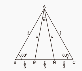 Seja ABC um triângulo equilátero e suponha que M e N são pontos pertencentes ao lado tais que BM = MN = NC. Sendo α a medida, em radianos, do ângulo MÂN , então o valor de cos α é
