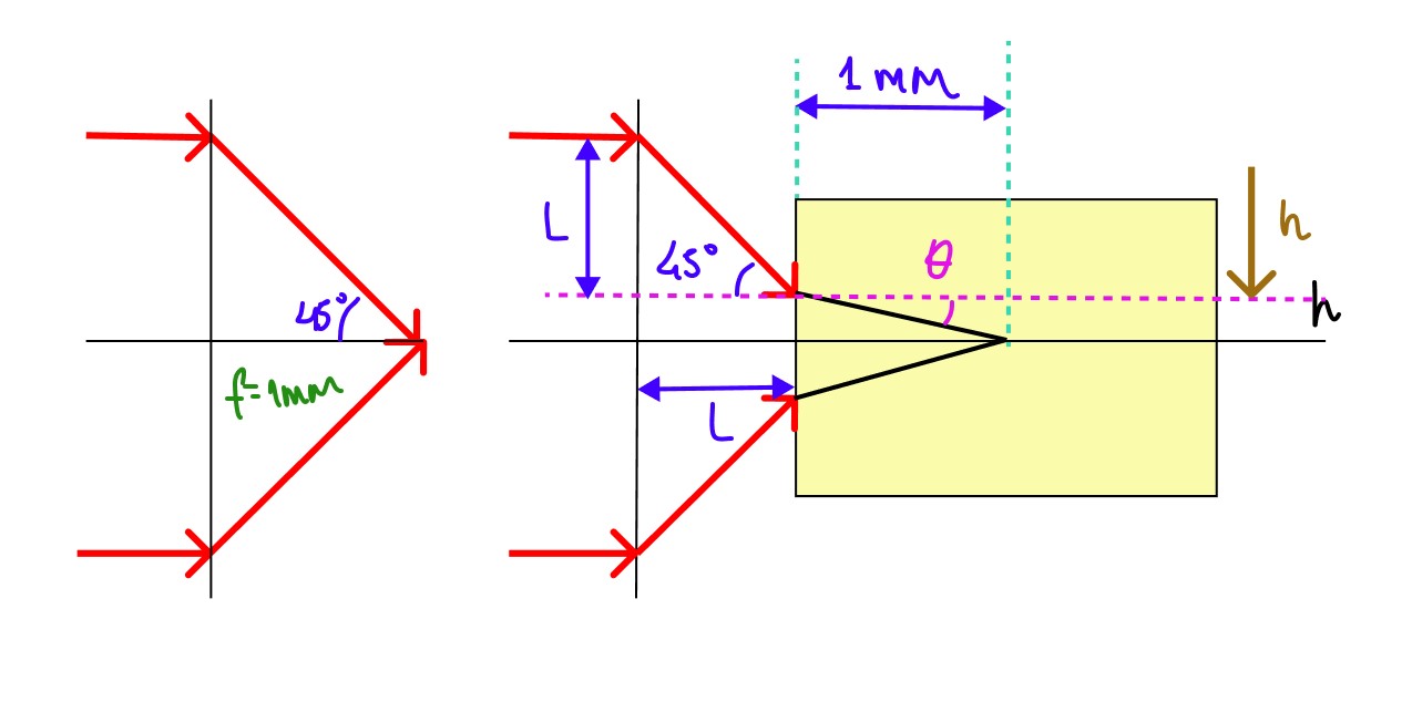 Dois raios luminosos paralelos e simétricos em relação ao eixo óptico, interdistantes de 2 mm, devem ser focados em um ponto P no interior de um bloco transparente, a 1 mm de sua superfície, conforme mostra a figura. Para tal, utiliza-se uma lente delgada convergente com distância focal de 1 mm. Considerando que o bloco tem índice de refração n = , a distância L entre o vértice V da lente e a superfície do bloco deve ser ajustada para