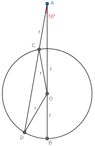 tal que O pertence ao segmento AB. Se o ângulo BÂD mede 10°, então a medida do ângulo BÔD é igual a