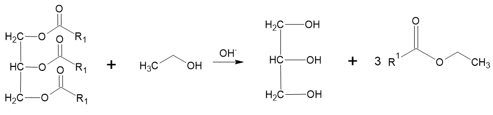 A obtenção de biodiesel a partir de óleos vegetais (triacilgliceróis) é uma alternativa para a produção de combustíveis menos poluentes, sendo possível catalisar a reação com um ácido ou uma base. Escreva a equação química balanceada que representa a reação: