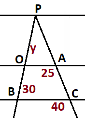 (UNESP - 2004) Um observador situado num ponto O, localizado na margem de um rio, precisa determinar sua distâcia até um ponto P, localizado na outra margem, sem atravessar o rio. Para isso marca, com estacas, outros pontos do lado da margem em que se encontra, de tal forma que P, O e B estão alinhados entre si e P, A e C também. Além disso, OA é paralelo a BC, OA = 25 m, BC = 40 m e OB = 30 m, conforme figura.